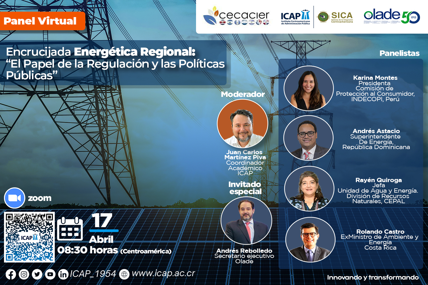 El INSTITUTO CENTROAMERICANO DE ADMINISTRACIÓN PÚBLICA (ICAP), con el que ARIAE firmó el pasado año un convenio de colaboración, ha programado un importante seminario titulado “Encrucijada Energética Regional - Papel de la Regulación y las Políticas Públicas” para el miércoles 17 de abril (08:30 horas de Centroamérica; 16:30 h España), para abordar el papel de la regulación y las políticas públicas de cara a afrontar la transición energética hacia la descarbonización.
