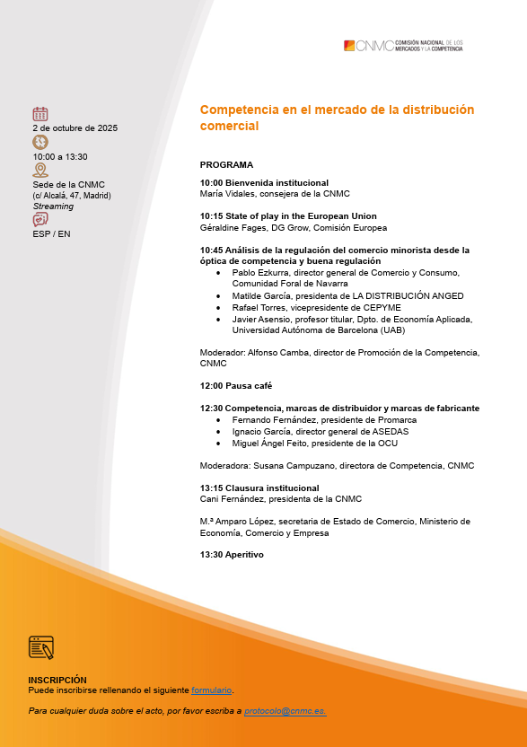 El pasado 2 de octubre, la CNMC celebró en Madrid la jornada "Competencia en el mercado de la distribución comercial". Se analizaron tanto la regulación existente para el establecimiento de grandes superficies como las relaciones entre marcas de fabricante y de distribuidor. <br> Más información: <a href="https://blog.cnmc.es/2025/10/23/como-mejorar-la-competencia-en-la-distr…; https://blog.cnmc.es/2025/10/23/como-mejorar-la-competencia-en-la-distr…; <br> <b>PROGRAMA</b> <br> Bienvenida institucional. María Vidales, consejera de la CNMC <br> State of play in the European Union. Géraldine Fages, DG Grow, Comisión Europea <br> Análisis de la regulación del comercio minorista desde la óptica de competencia y buena regulación: