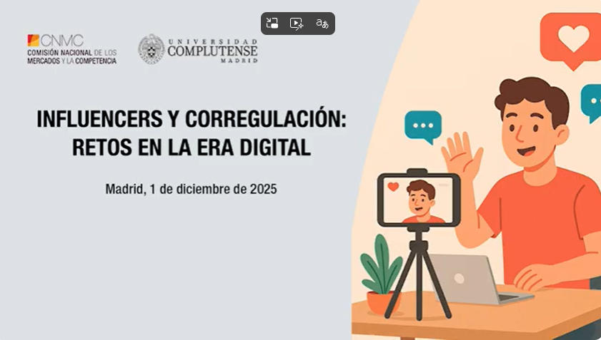 Bienvenida institucional. Cani Fernández, presidenta de la CNMC (0:03:00-0:09:01) <br> Creadores ante la regulación. Carlos Aguilar, consejero de la CNMC y presidente del Comité Europeo de Servicios de Medios de Comunicación (0:09:02-0:13:40) <br> Objeto y descripción de la normativa. Loreto Corredoira, chair de la Cátedra Jean Monnet Decoding-i-disorders de la Universidad Complutense de Madrid (0:13:41-0:35:14) <br> Retos regulatorios de los Usuarios de Especial Relevancia (UER). Cristóbal Gázquez, presidente de la Unión Española de Creadores; Marta Becerra, mánager de Relaciones Institucionales y Asuntos Públicos en Google; Charo Fernando, subdirectora general de Autocontrol; Marta Pellico, vicepresidenta de iCmedia; José Ángel García, subdirector de Audiovisual de la CNMC. Modera: Borja Adsuara, abogado experto en derecho digital (0:35:15-1:23:28) <br> La nueva realidad de la publicidad en los influencers. Sergio Barreda, presidente de la Asociación de Profesionales de Influencia Digital de España (APIDE); Hélène Verbrugghe, responsable de Asuntos Públicos de Meta para España y Portugal; Arancha de Dios, directora jurídica de la Asociación Española de Anunciantes (AEA); Alejandro Perales, presidente de la Asociación de Usuarios de la Comunicación (AUC); María José Roldán, subdirectora general de Inspección y Procedimiento Sancionador, Ministerio de Derechos Sociales, Consumo y Agenda 2030; Pedro Martín, jefe de área en la Subdirección de Audiovisual de la CNMC. Modera: Alejandra de Iturriaga, directora de Telecomunicaciones y del Sector Audiovisual de la CNMC (1:23:29-2:08:32) <br> Conclusiones. Esther Martínez, catedrática de la Universidad Rey Juan Carlos (2:08:33-2:20:24) <br> Clausura institucional. Ángel García Castillejo, vicepresidente de la CNMC (2:20:25-2:30:36)